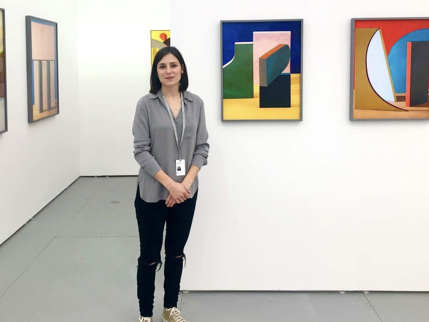 Bianca Bosker in front of the Denny Dimin Gallery booth of artwork by Erin O'Keefe at Untitled Art Fair in Miami Beach, 2018.