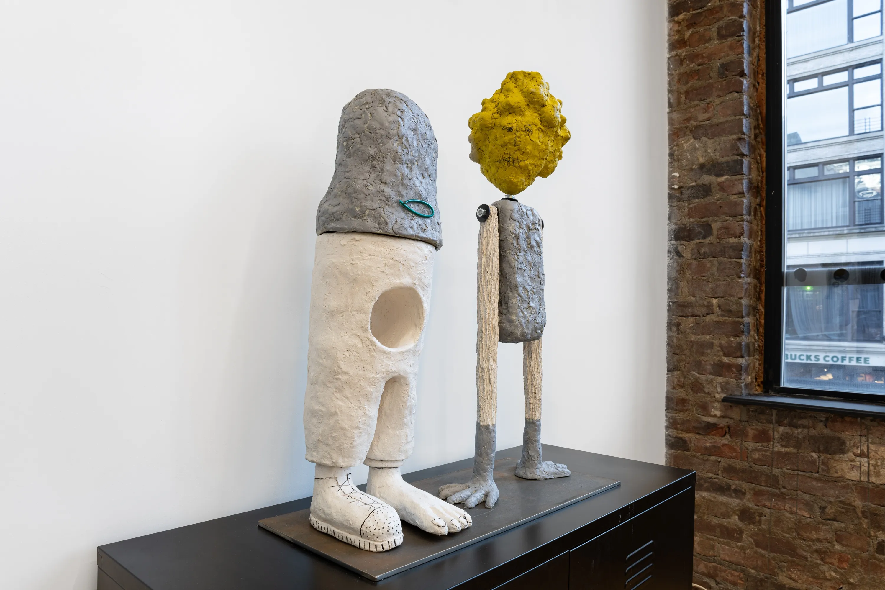 Honing in on the distinct upright posture that distinguishes humans from most species, Stern omits a majority of facial features and distills the bodies into basic geometric shapes, unifying the forms in an androgynous sort of way. Vintage accessories such as Mary Janes, a lace-up black and white Oxford, and makeshift hats suggest token symbols of applied gender, an element of dress up and costume play. Sparsely and randomly outfitted in dated yet arguably classic fashions, many of the figures sport one shoe, the other conspicuously missing, one of many tells upending their futile attempt to assimilate with everyday gallery goers. Such is the case in Couple (2024), the sculptural pairing of two figures perched atop a storage cabinet to the left of the gallery desk. Here, the figure on the left of the duo has one sculpted shoe and one bare foot. Their partner sits upright on two limbs which serve as both arms and legs, resting on claw-like appendages whose appearance oscillates between hands or potentially the feet of an animal such as a bird. Sculpted lines in the limbs of this figure suggest mounds of matted fur or feathers yet also evoke tree bark. This theme of hybridity continues throughout the show as Stern scaffolds her figures employing elements of nature, domestic fabrication, industrial ephemera, nods to materiality and the studio process.